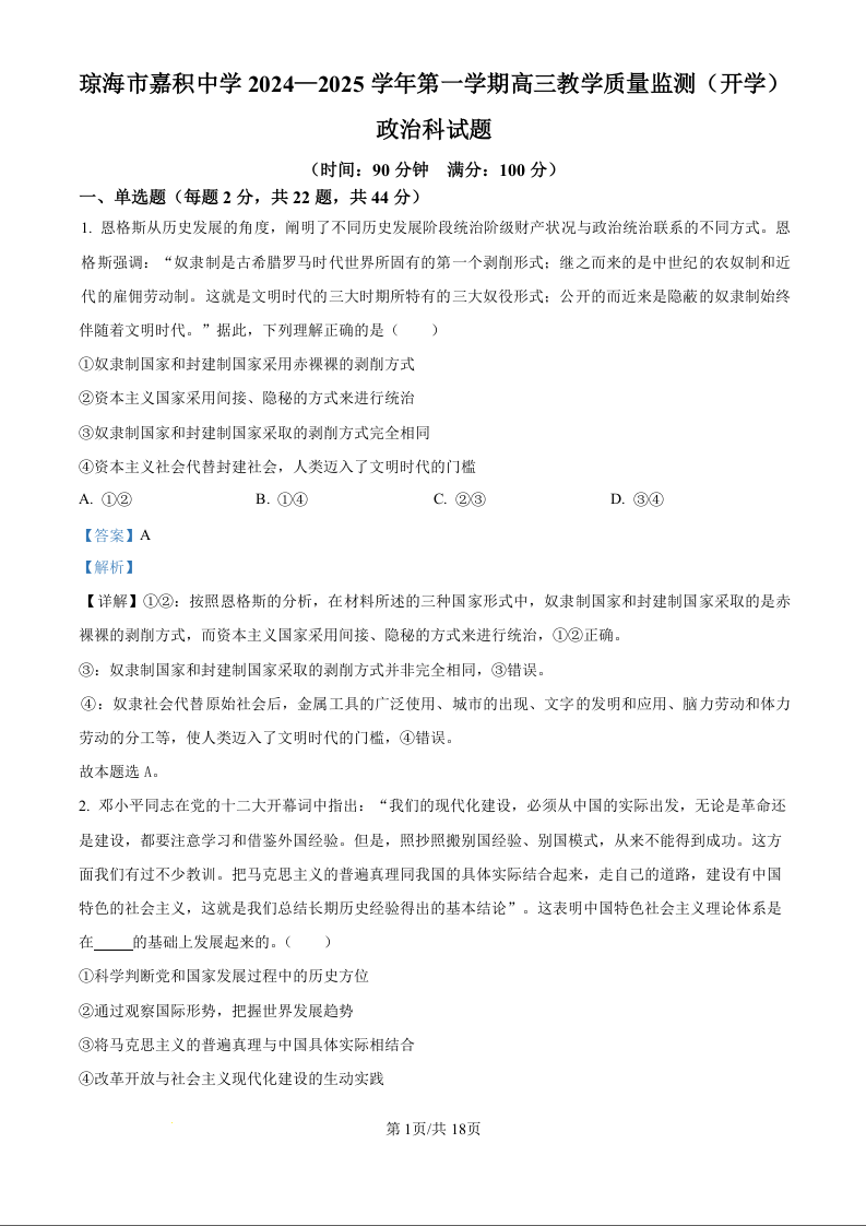 海南省琼海市嘉积中学2024-2025学年第一学期高三教学质量检测政治试题(解析版)