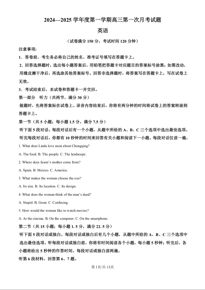 海南省文昌中学2024-2025学年度第一学期高三第一次月考试题英语试题(原卷版)