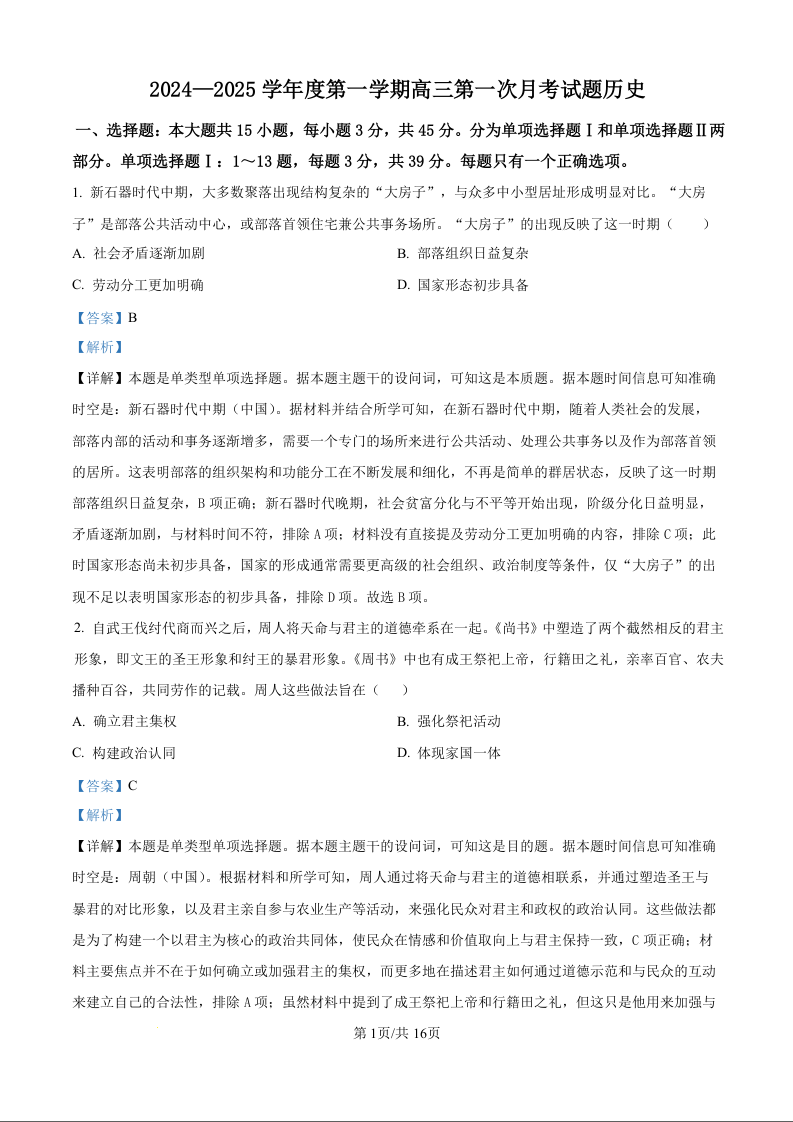 海南省文昌中学2024-2025学年度第一学期高三第一次月考试题历史试题(解析版)