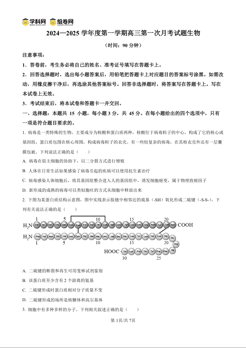 海南省文昌中学2024-2025学年度第一学期高三第一次月考试题生物试题(原卷版)