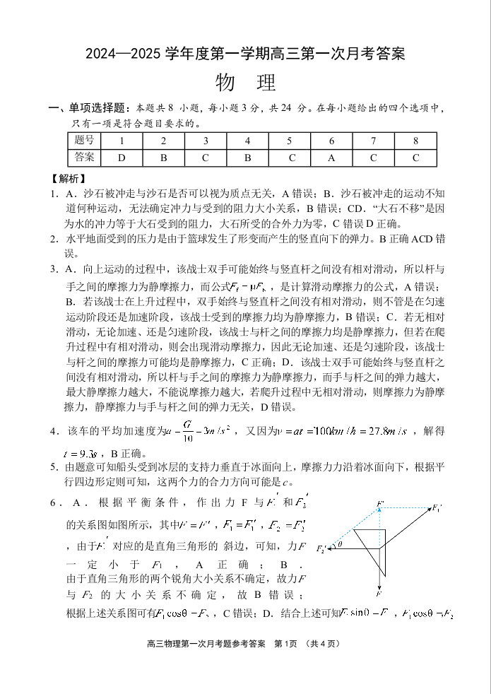 海南省文昌中学2024-2025学年度第一学期高三第一次月考试题物理答案