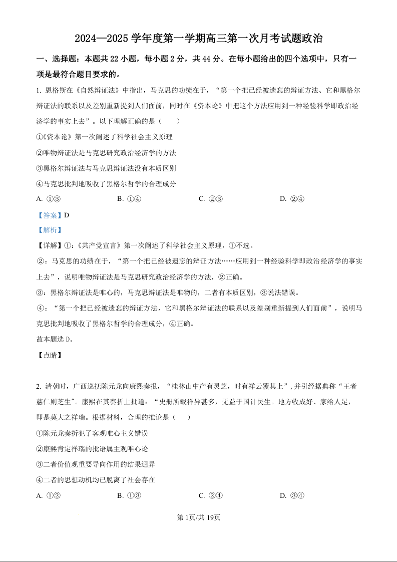 海南省文昌中学2024-2025学年度第一学期高三第一次月考试题政治试题(解析版)