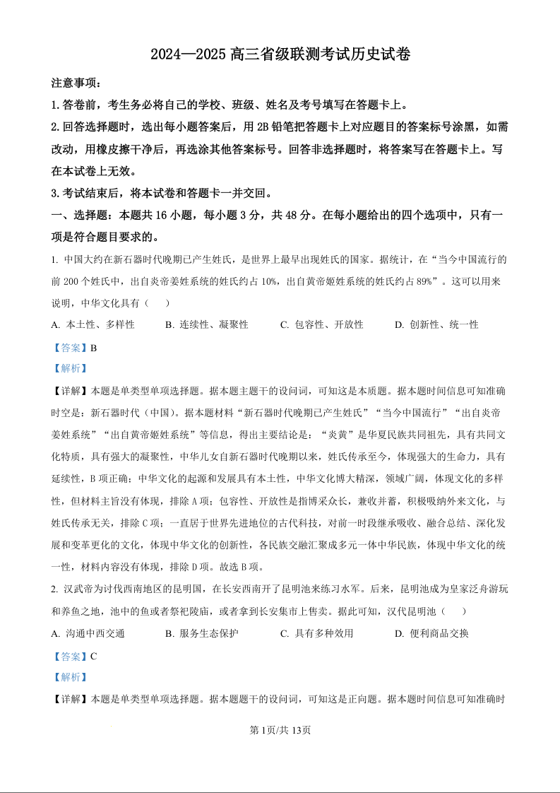 河北省2024-2025届高三省级联测考试(9月)历史试题(解析版)