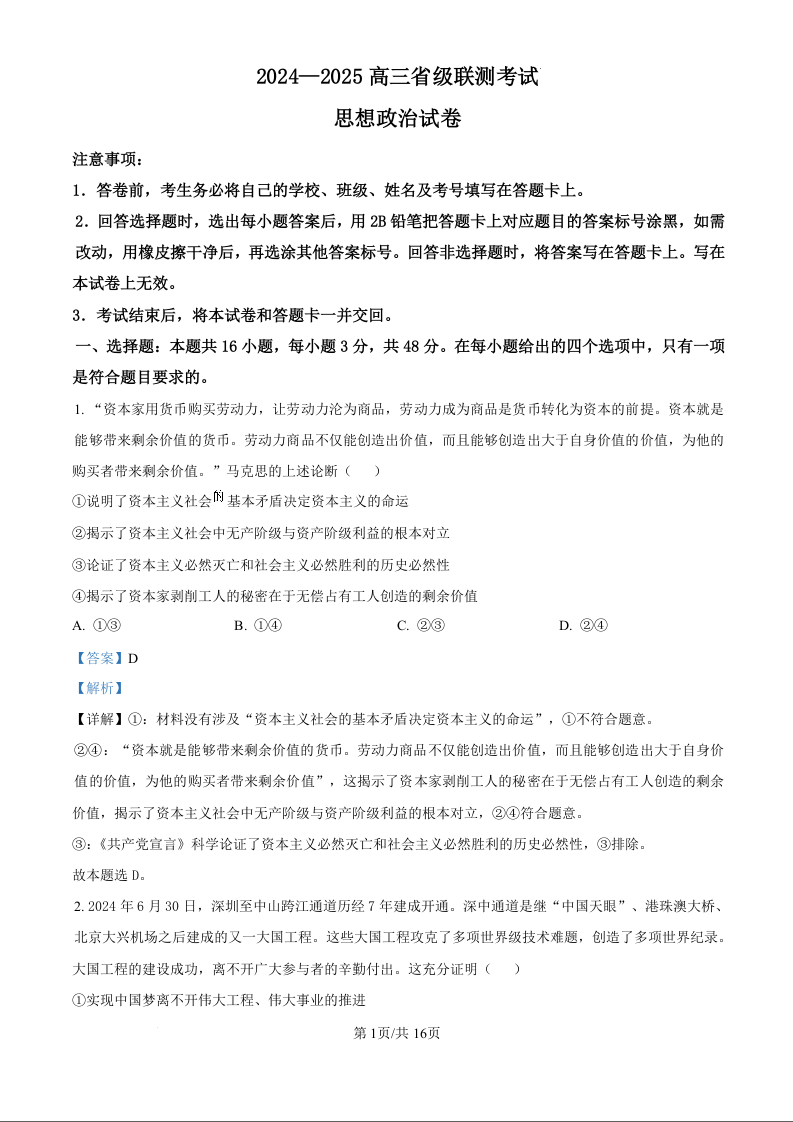 河北省2024-2025届高三省级联测考试(9月)政治试题(解析版)