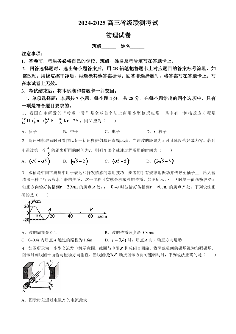 河北省2024-2025届高三省级联测考试(9月)物理+答案