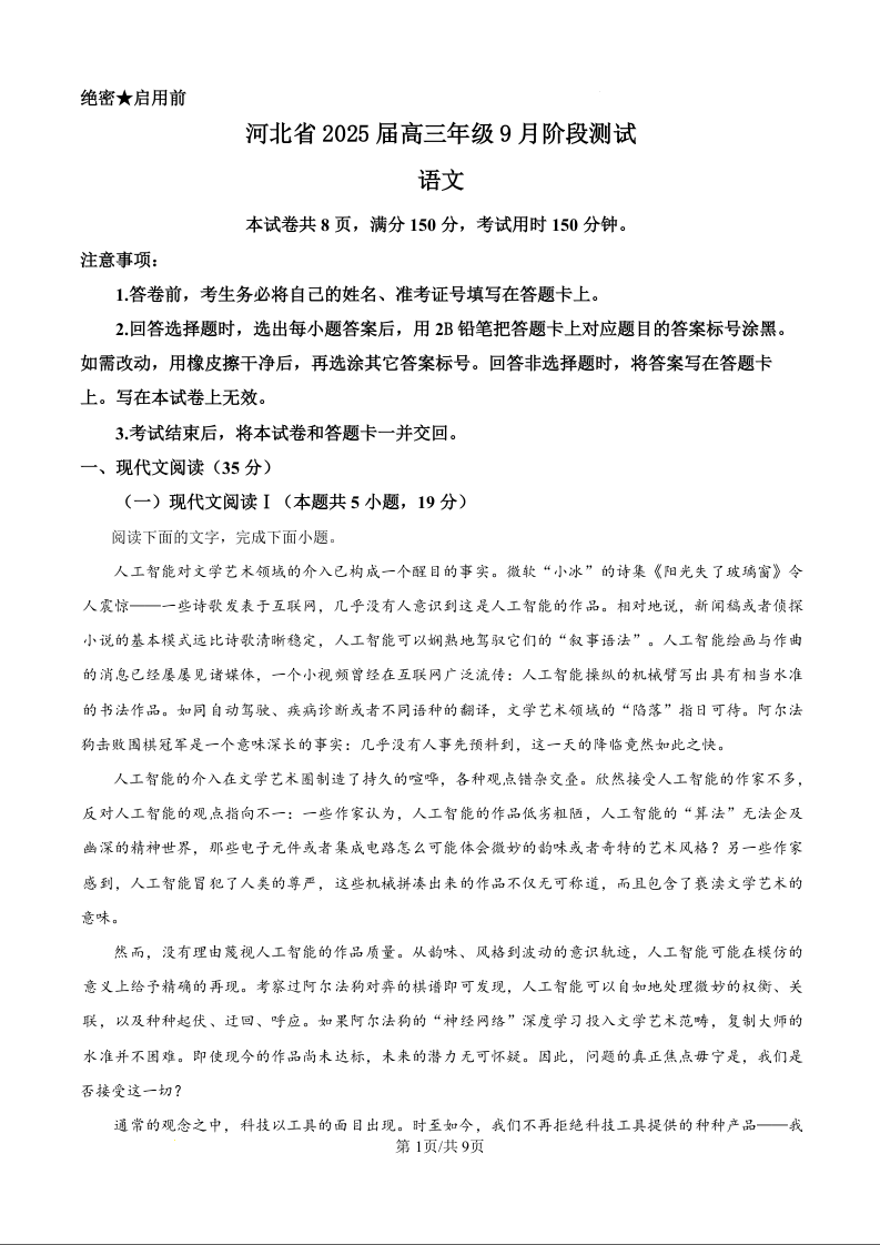 河北省2025届高三9月阶段性检测语文试题(原卷版)