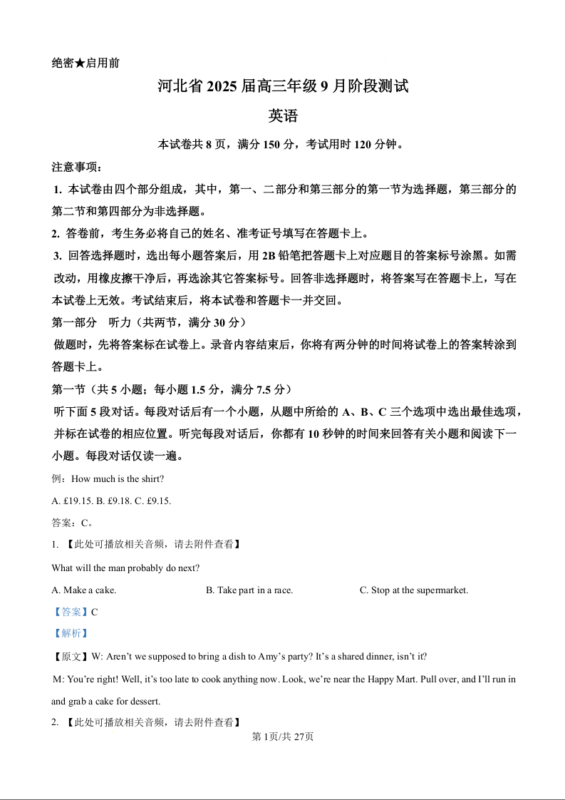 河北省2025届高三9月阶段性检测英语试题(解析版)
