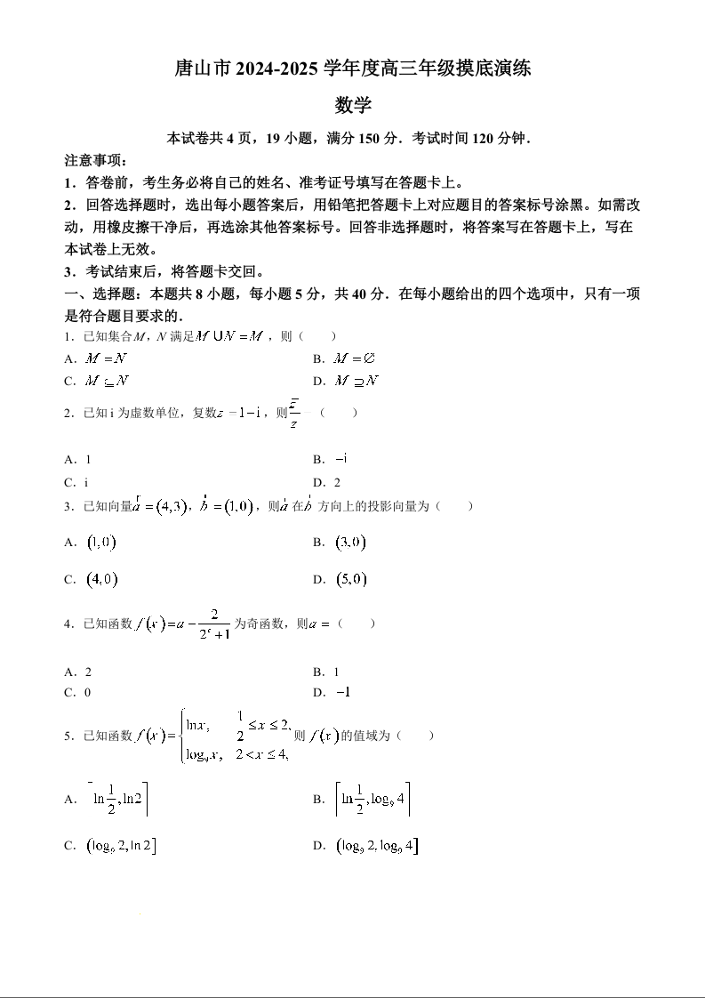 河北省唐山市2024-2025学年度高三年级开学摸底演练数学试题