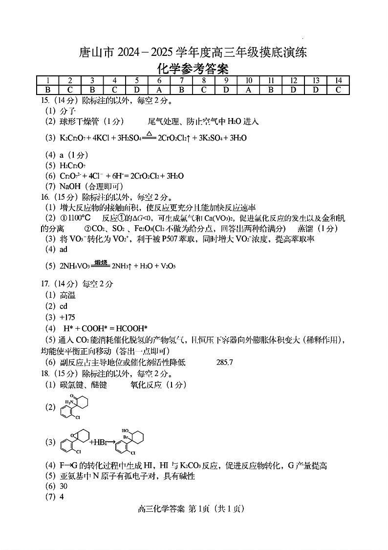河北省唐山市2024-2025学年度高三年级开学摸底演练化学答案