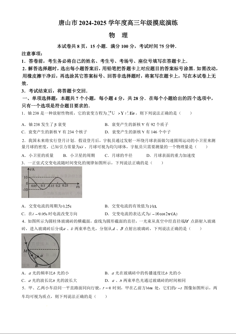 河北省唐山市2024-2025学年度高三年级开学摸底演练物理