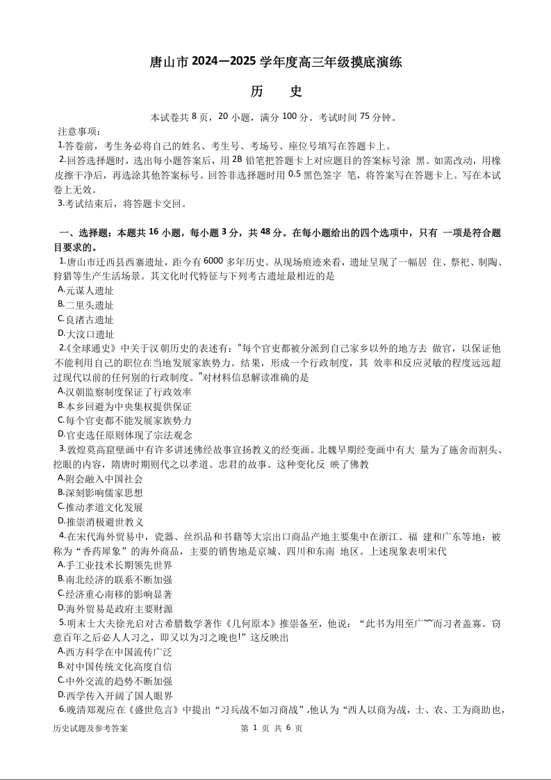 河北省唐山市2024-2025学年度高三年级开学摸底演练历史+答案