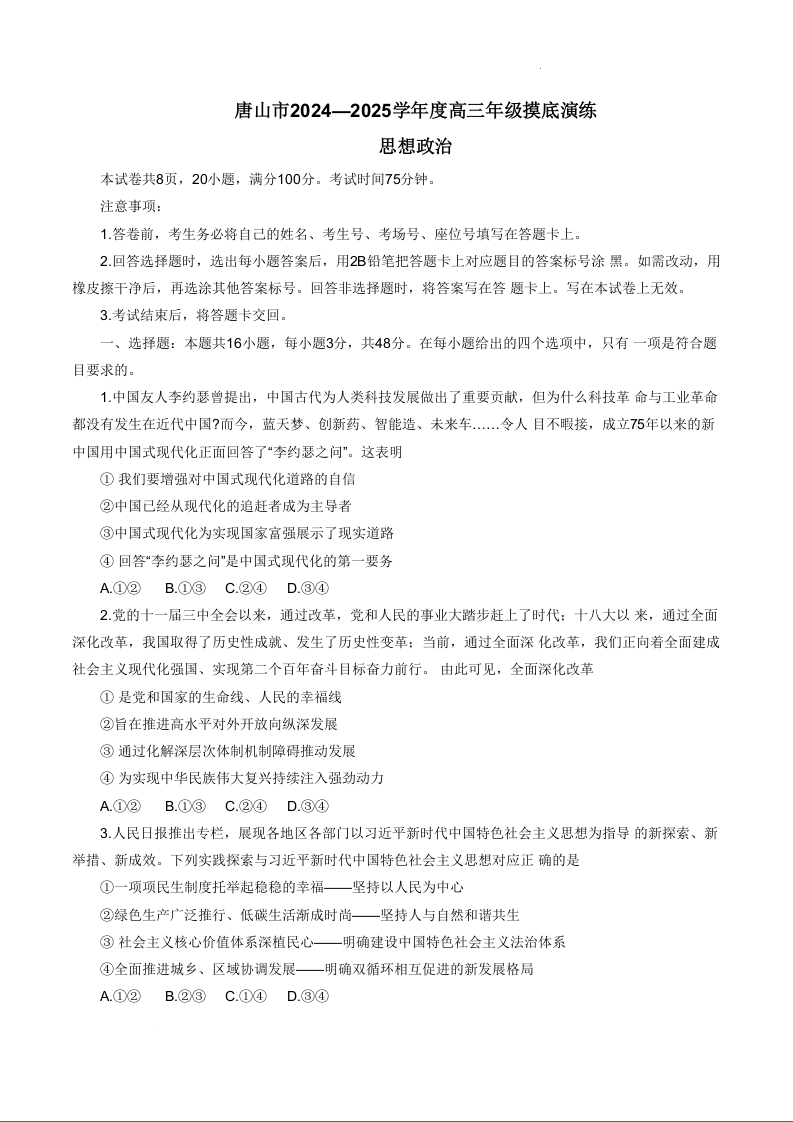 河北省唐山市2024-2025学年度高三年级开学摸底演练政治