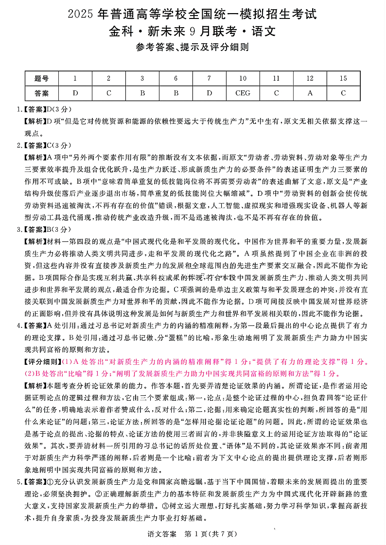 河南省2025年普通高等学校全国统一模拟招生考试9月联考语文答案