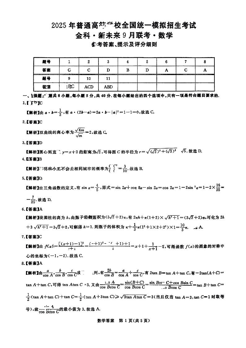 河南省2025年普通高等学校全国统一模拟招生考试9月联考数学答案