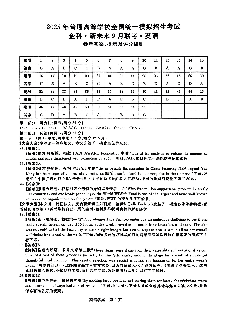 河南省2025年普通高等学校全国统一模拟招生考试9月联考英语答案