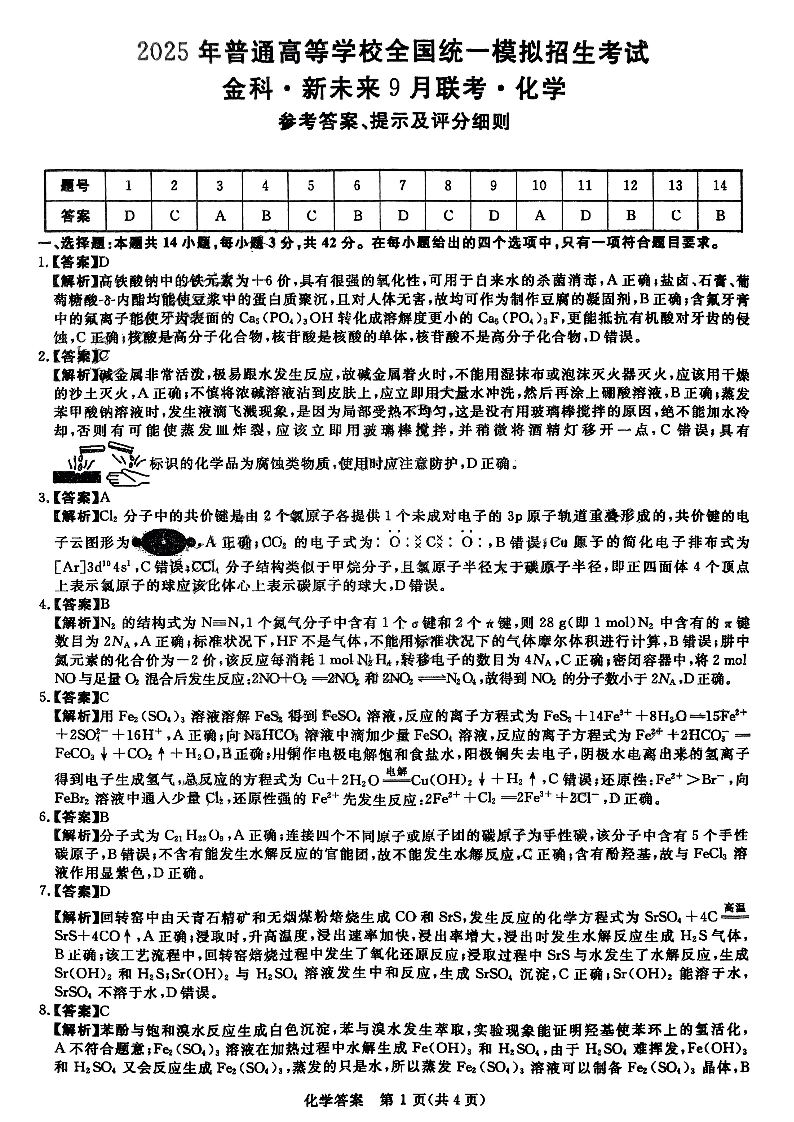 河南省2025年普通高等学校全国统一模拟招生考试9月联考化学答案