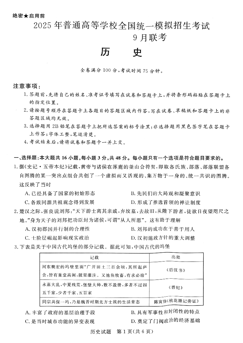 河南省2025年普通高等学校全国统一模拟招生考试9月联考历史