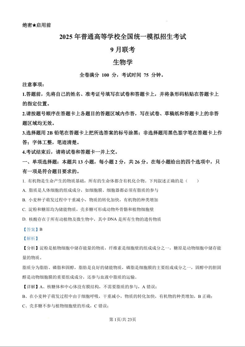 河南省2025年普通高等学校全国统一模拟招生考试9月联考生物试题(解析版)