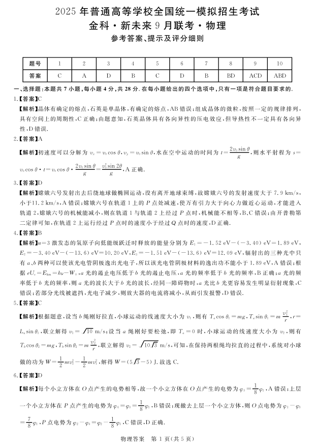 河南省2025年普通高等学校全国统一模拟招生考试9月联考物理答案