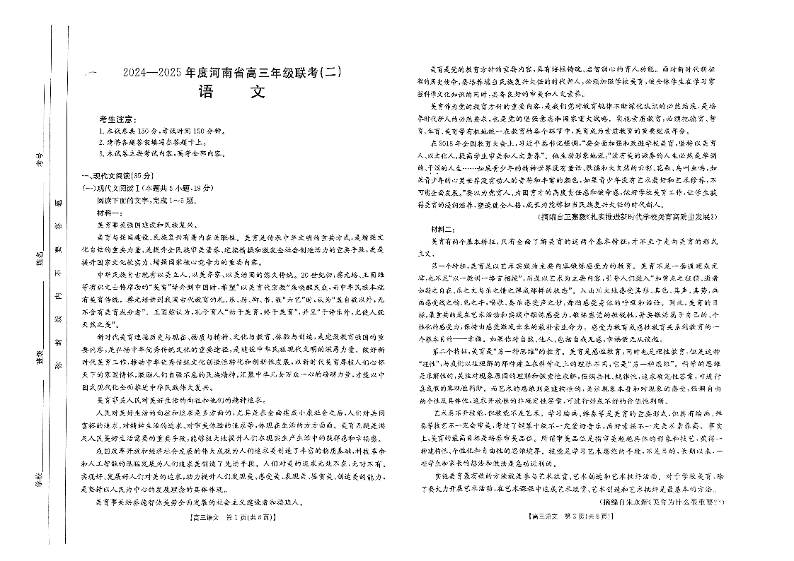 河南省部分学校2024-2025年度高三年级联考(二)语文