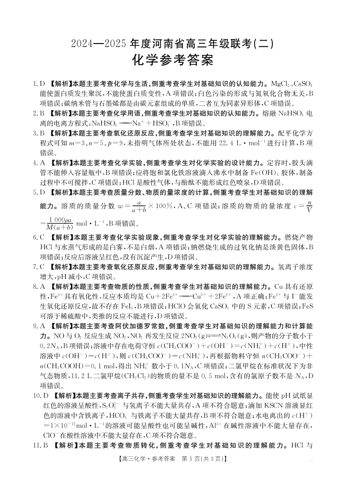 河南省部分学校2024-2025年度高三年级联考(二)化学答案