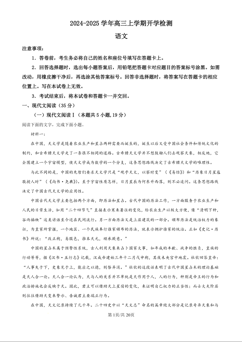 河南省许昌高级中学2024-2025学年高三上学期开学检测语文试题(解析版)