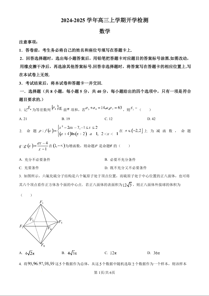 河南省许昌高级中学2024-2025学年高三上学期开学检测数学试题(原卷版)