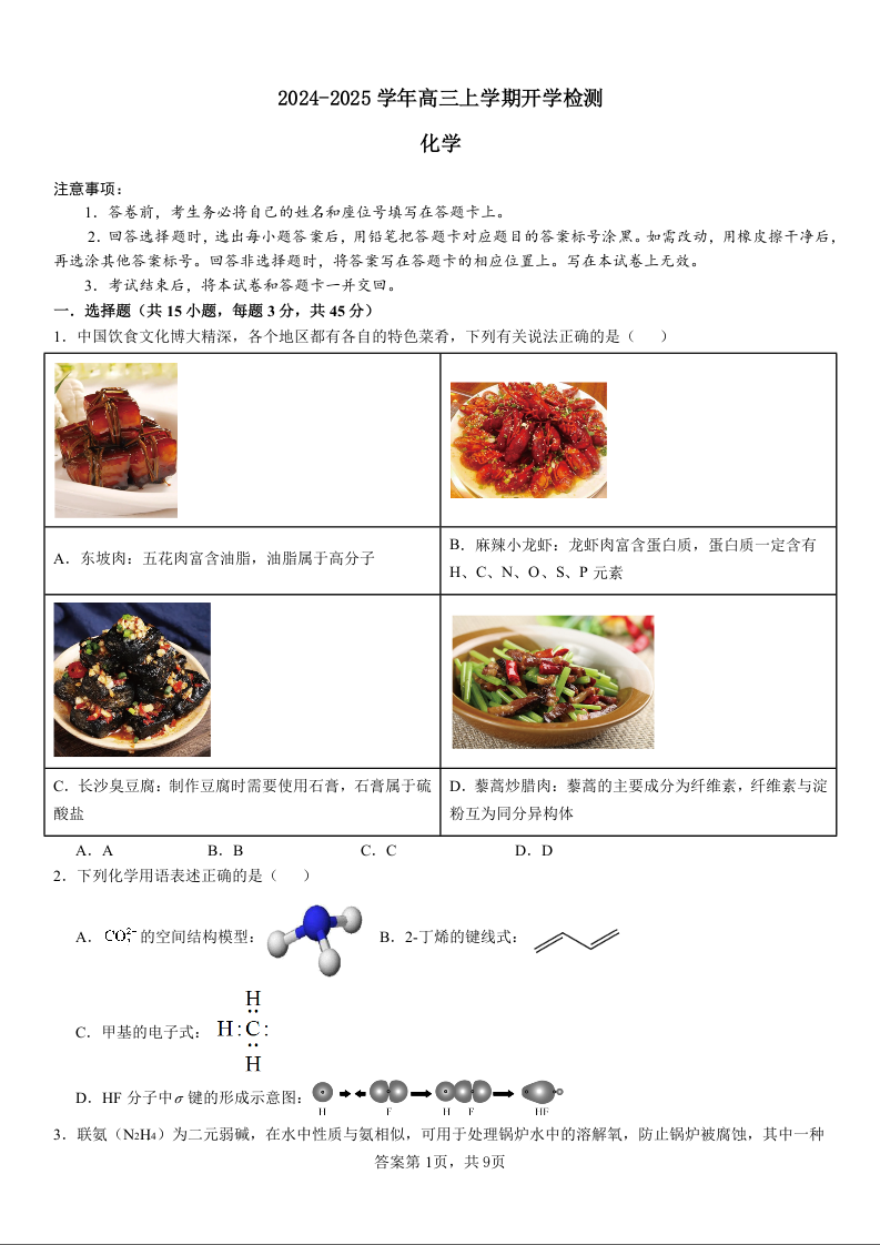 河南省许昌高级中学2024-2025学年高三上学期开学检测化学
