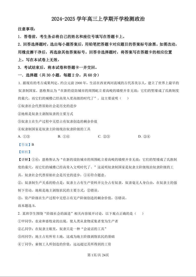 河南省许昌高级中学2024-2025学年高三上学期开学检测政治试题(解析版)
