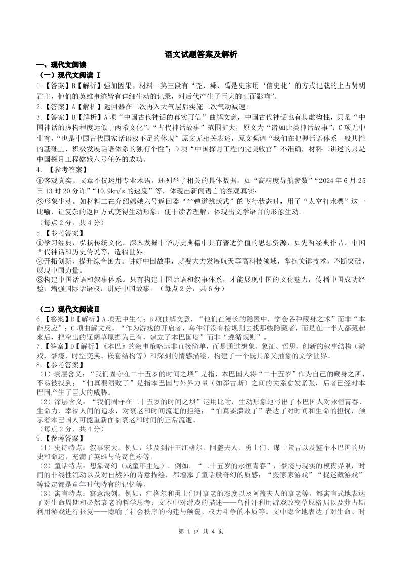 黑龙江省大庆市2025届高三上学期第一次教学质量检测语文答案