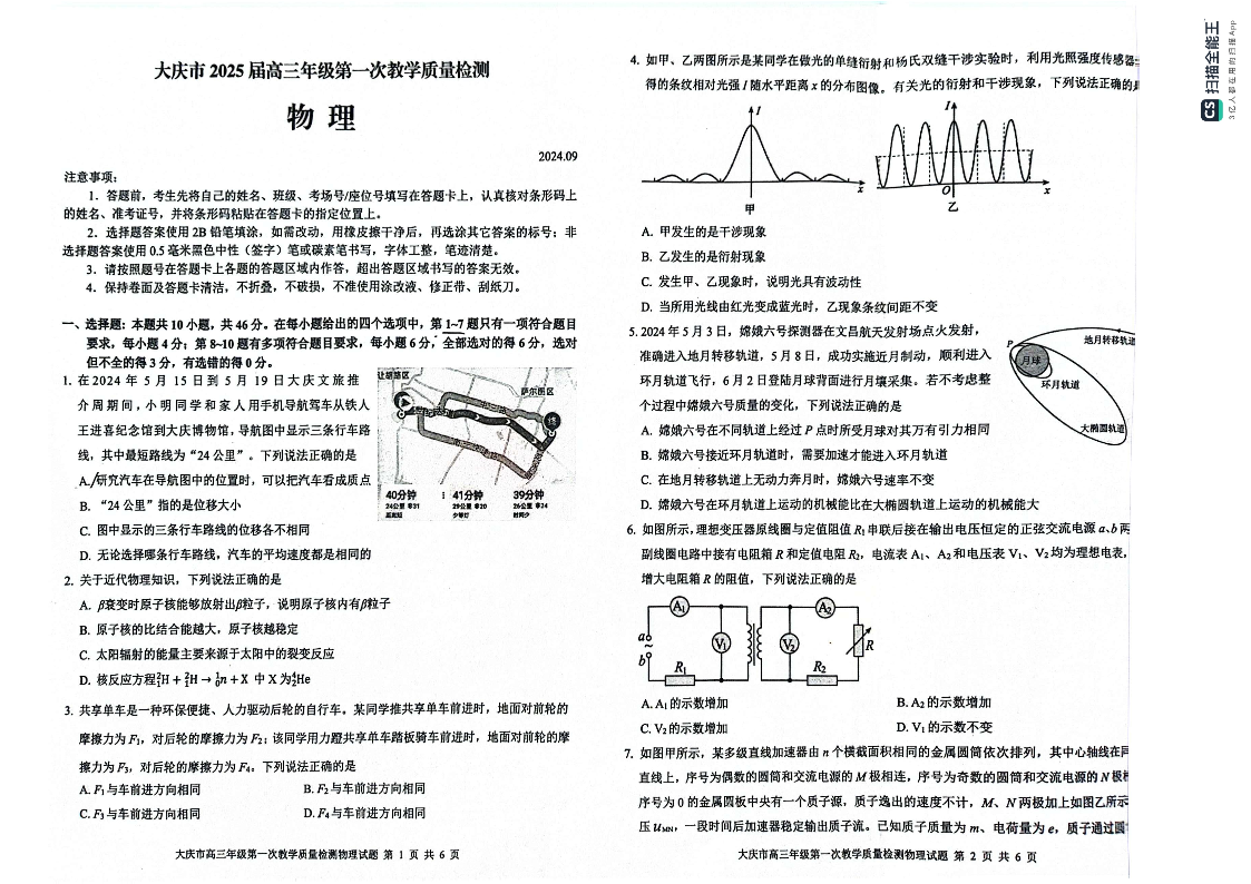 黑龙江省大庆市2025届高三上学期第一次教学质量检测物理