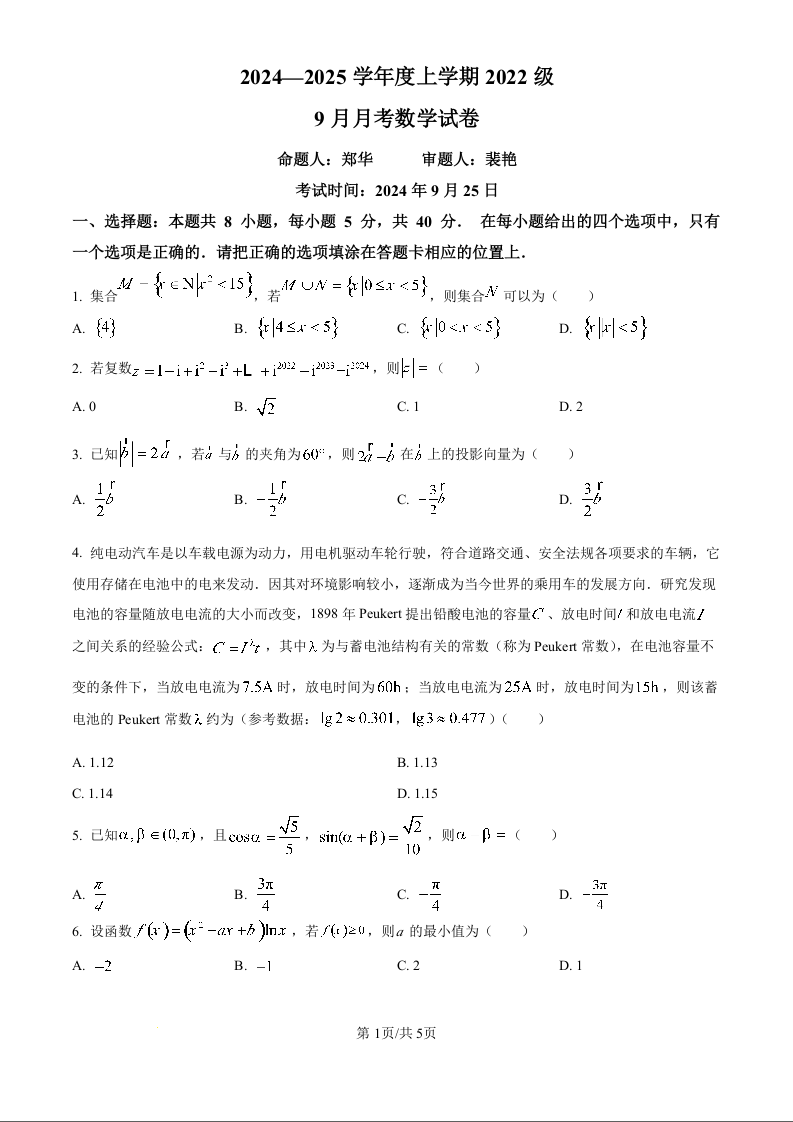 湖北省沙市中学2024-2025学年度上学期2022级9月月考数学试题(原卷版)