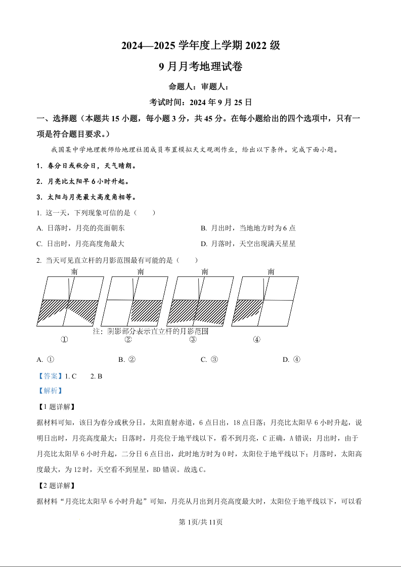 湖北省沙市中学2024-2025学年度上学期2022级9月月考地理试题(解析版)