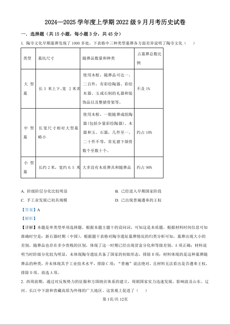 湖北省沙市中学2024-2025学年度上学期2022级9月月考历史试题(解析版)