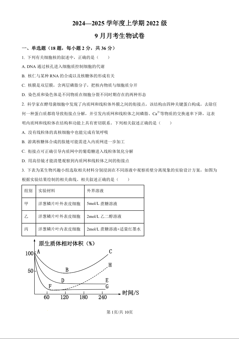 湖北省沙市中学2024-2025学年度上学期2022级9月月考生物试题(原卷版)