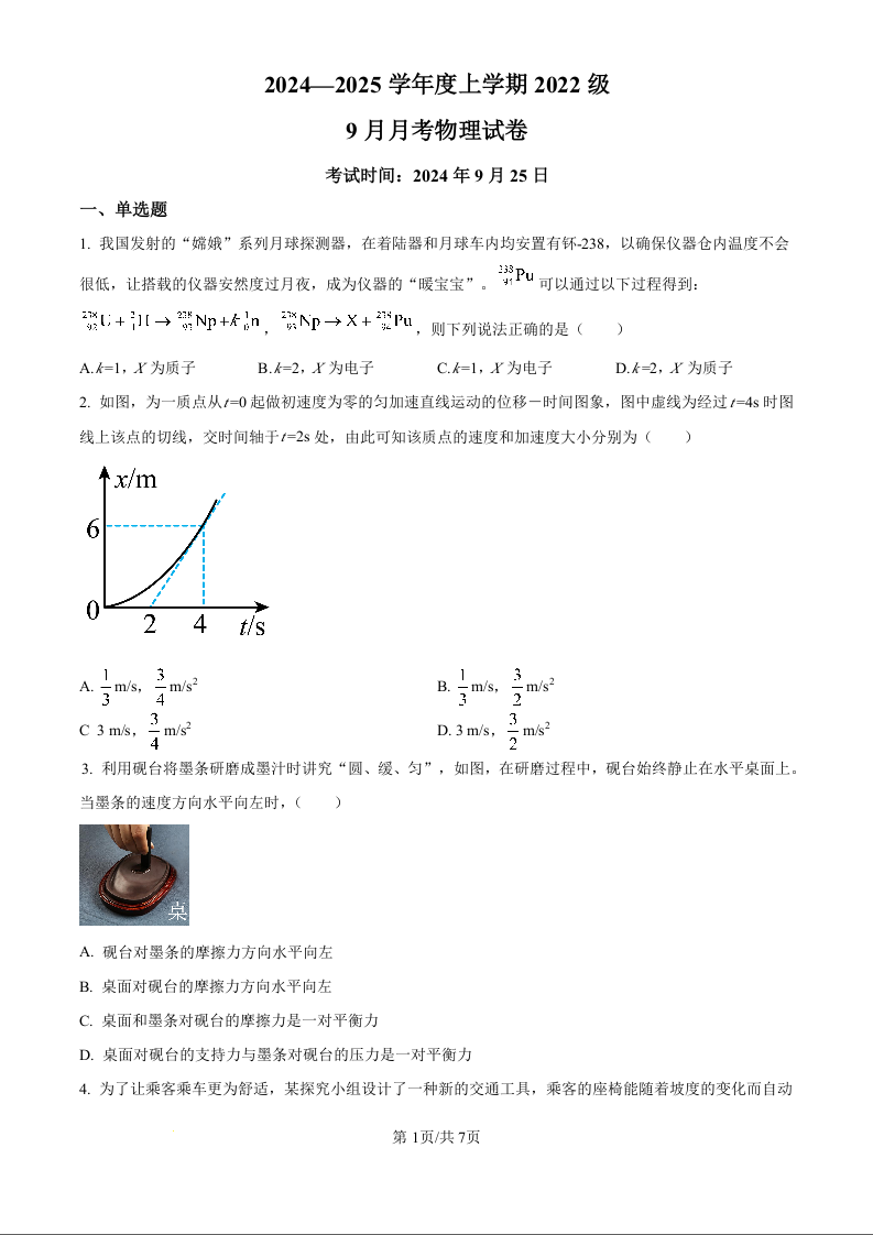 湖北省沙市中学2024-2025学年度上学期2022级9月月考物理试题(原卷版)