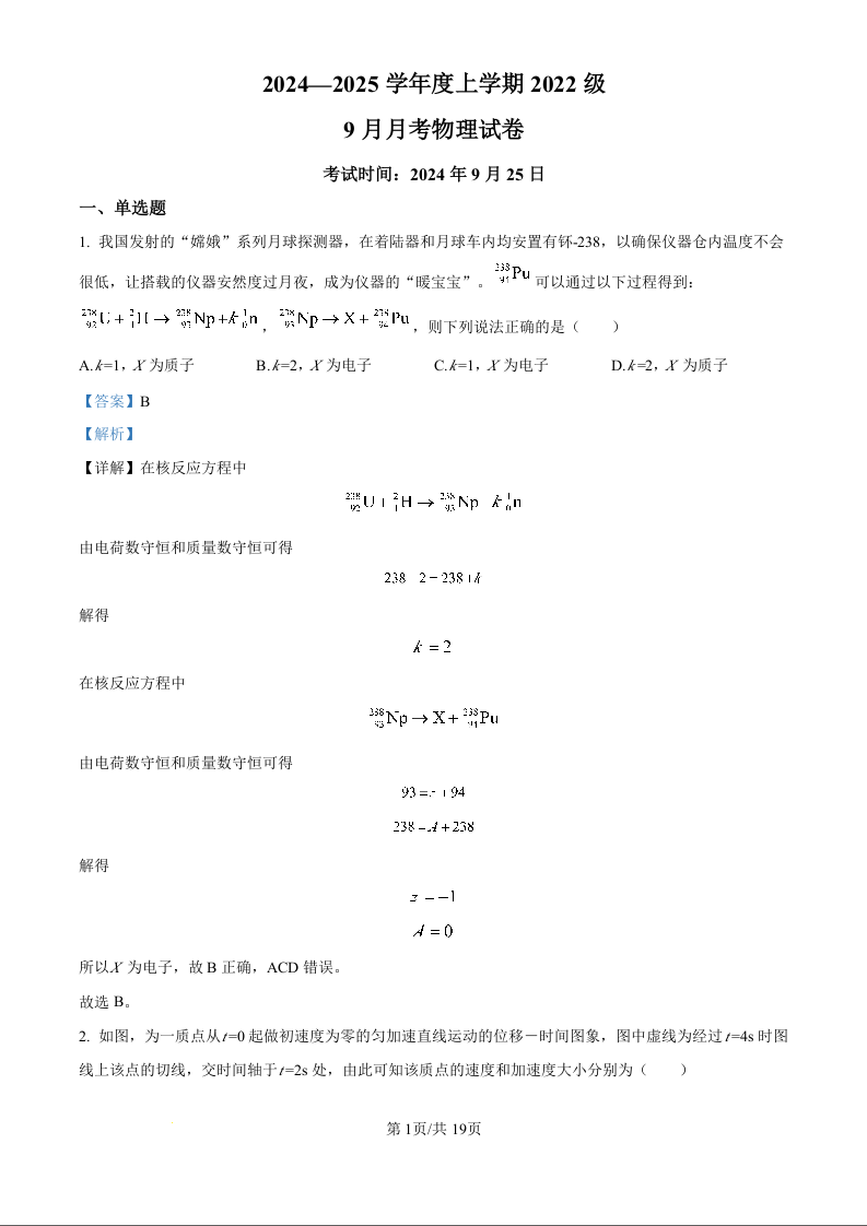 湖北省沙市中学2024-2025学年度上学期2022级9月月考物理试题(解析版)