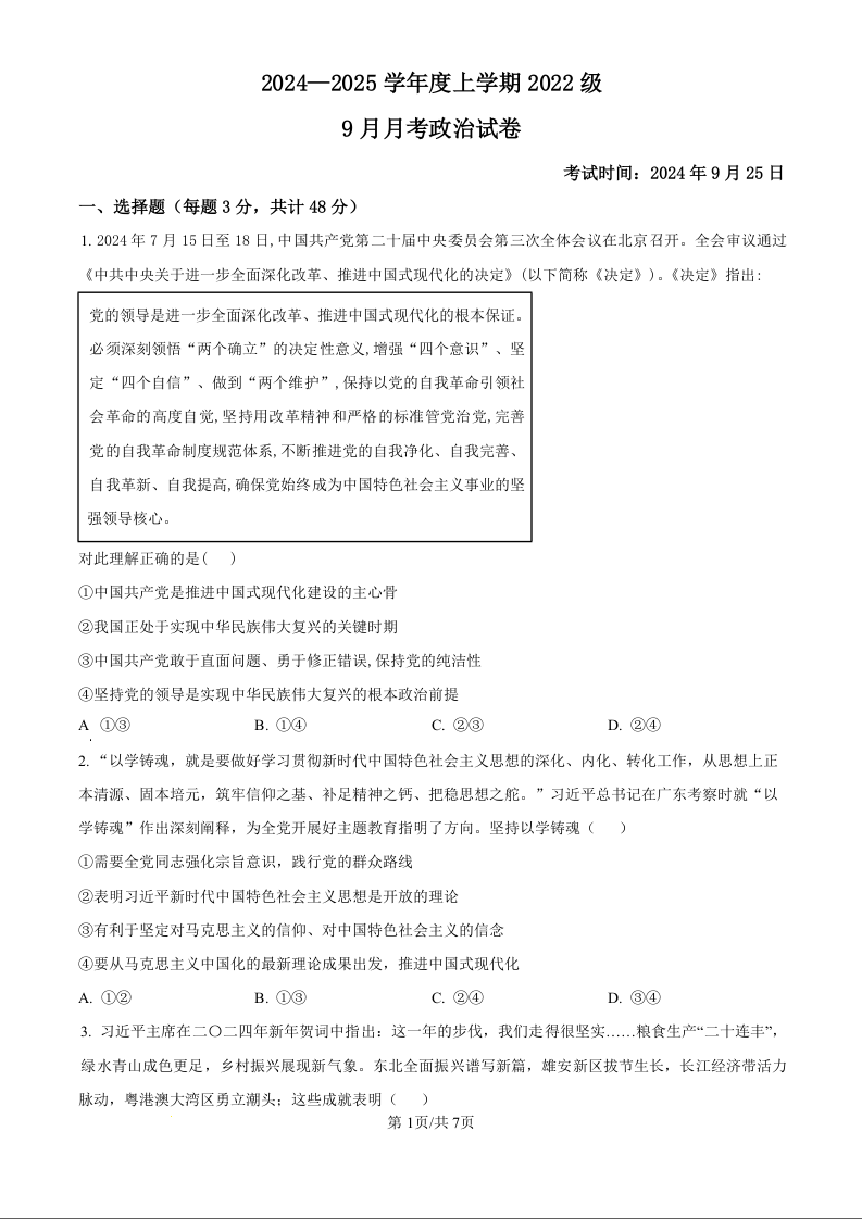 湖北省沙市中学2024-2025学年度上学期2022级9月月考政治试题(原卷版)