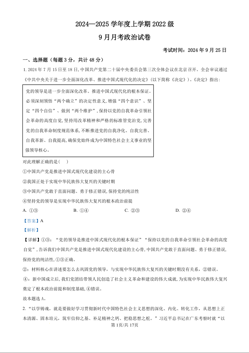 湖北省沙市中学2024-2025学年度上学期2022级9月月考政治试题(解析版)