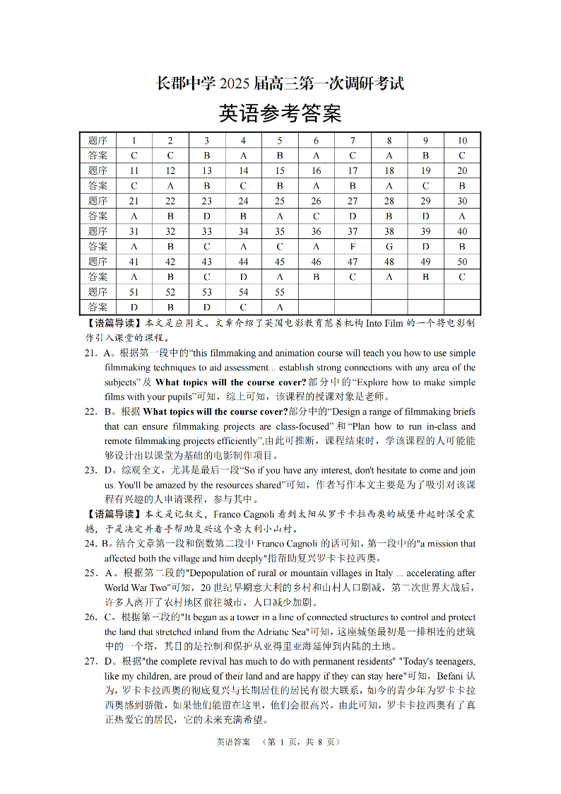 湖南省长郡中学2025届高三上学期第一次调研考试英语答案