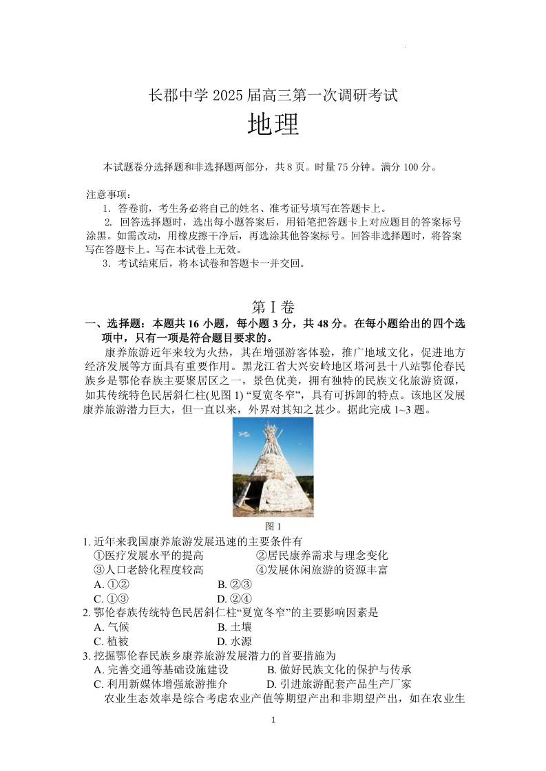 湖南省长郡中学2025届高三上学期第一次调研考试地理