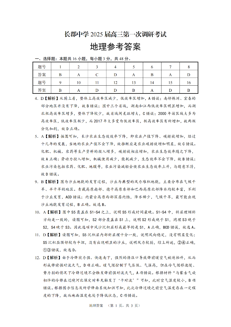 湖南省长郡中学2025届高三上学期第一次调研考试地理答案