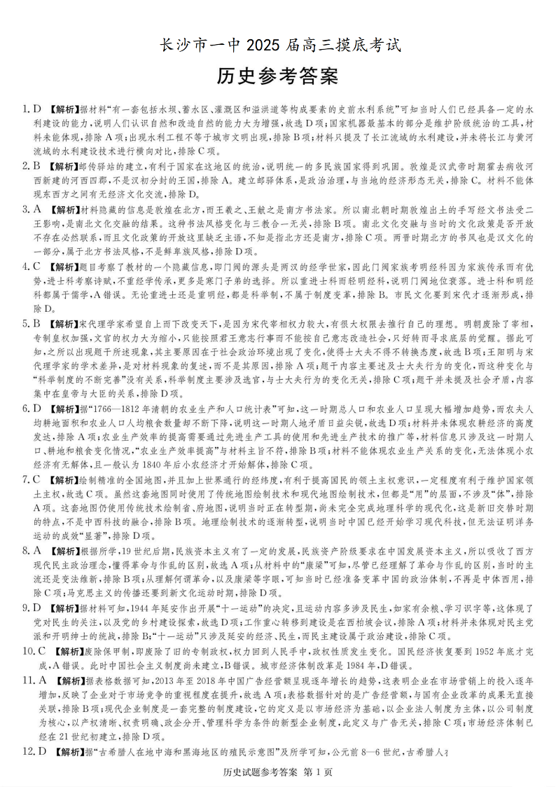湖南省长沙市第一中学2025届高三上学期摸底考试历史答案