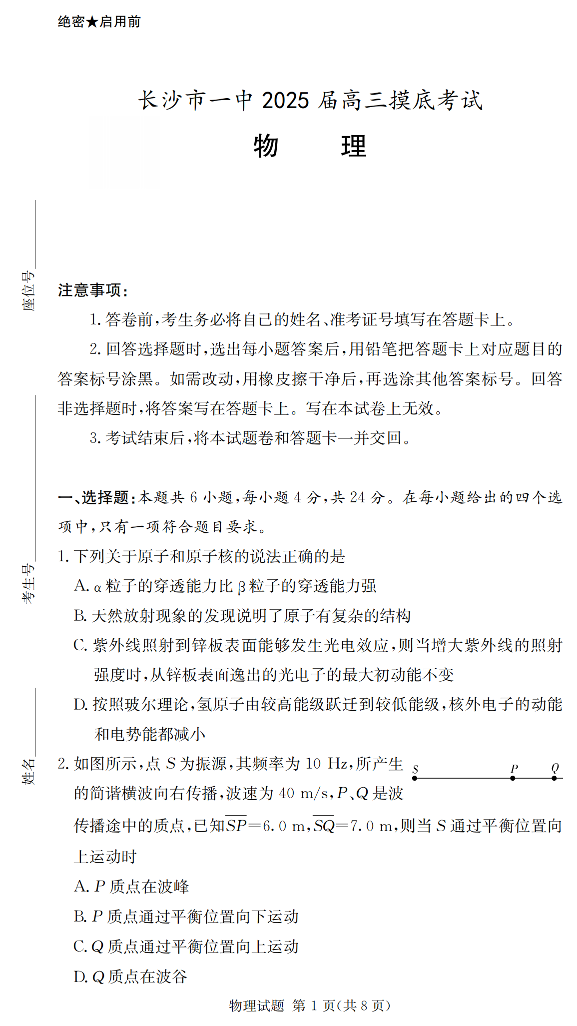 湖南省长沙市第一中学2025届高三上学期摸底考试物理+答案