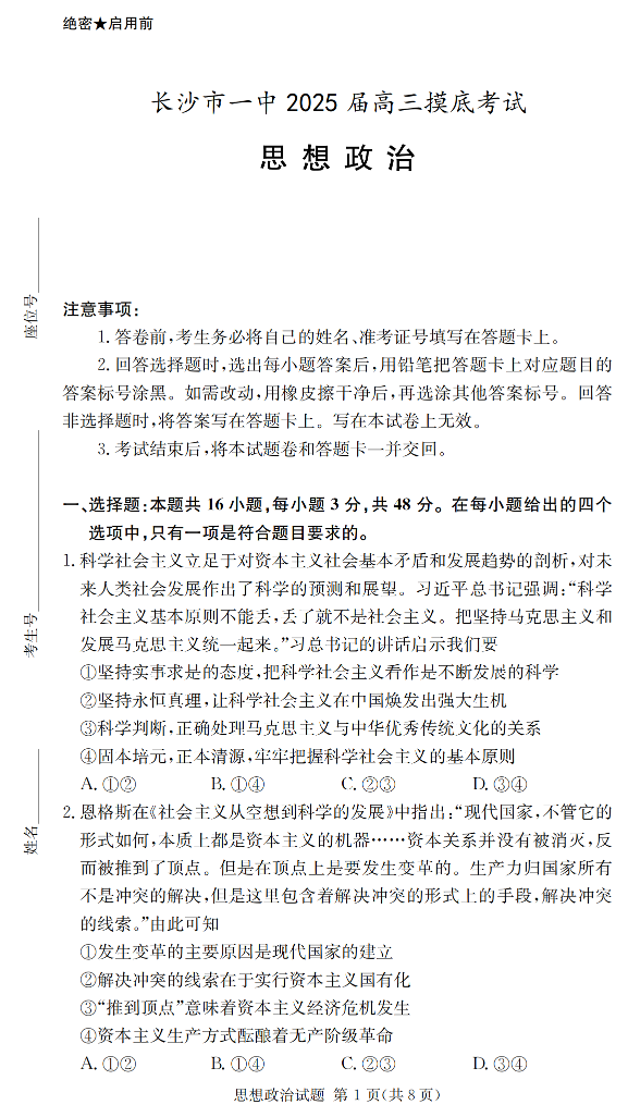 湖南省长沙市第一中学2025届高三上学期摸底考试政治+答案