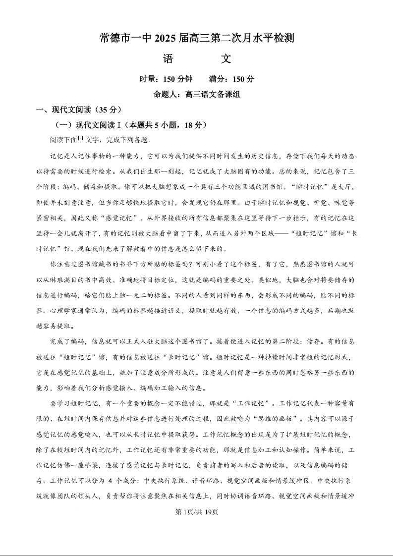 湖南省常德市第一中学2025届高三第二次月水平检测语文试题(解析版)