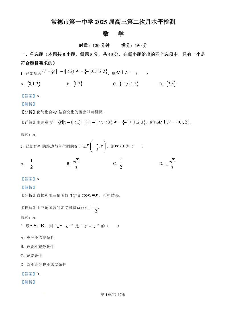 湖南省常德市第一中学2025届高三第二次月水平检测数学试题(解析版)
