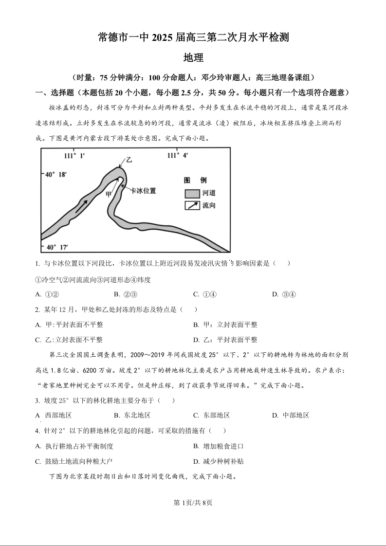 湖南省常德市第一中学2025届高三第二次月水平检测地理试题(原卷版)