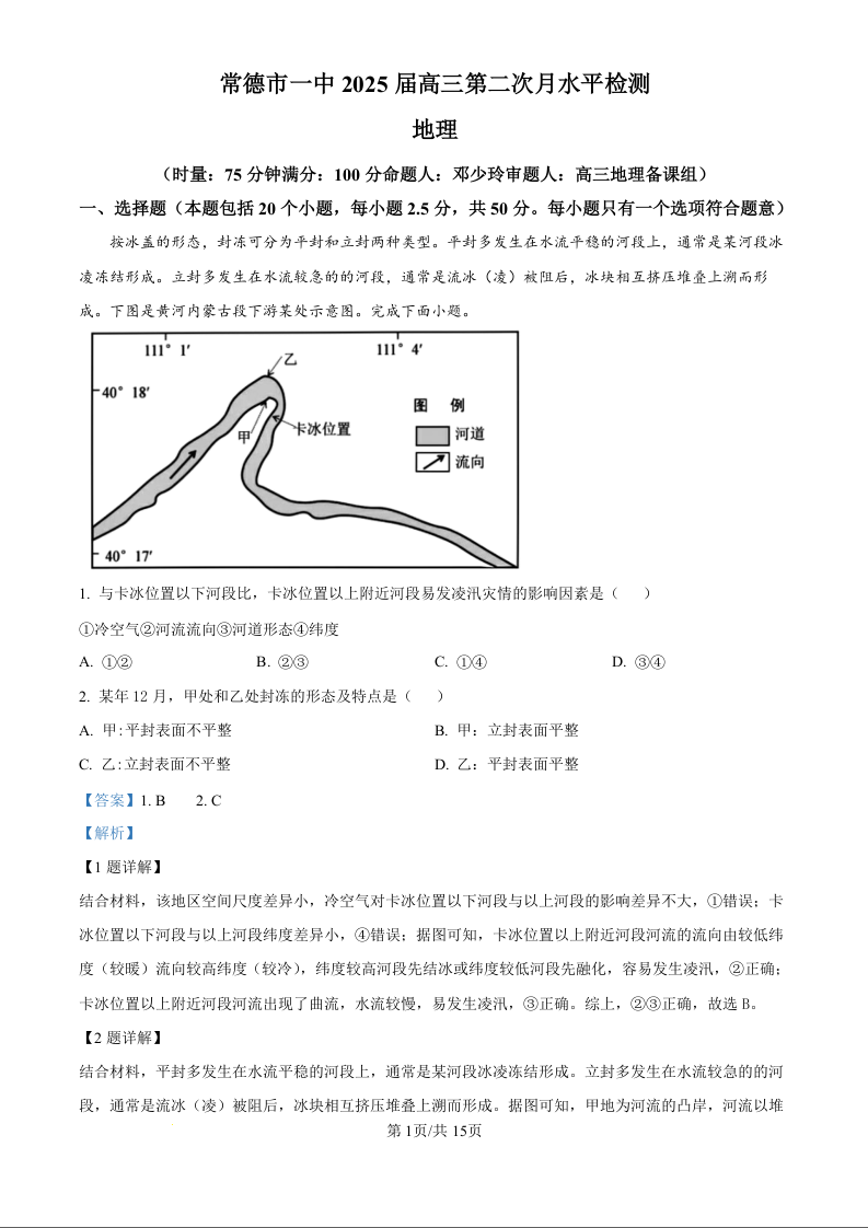湖南省常德市第一中学2025届高三第二次月水平检测地理试题(解析版)