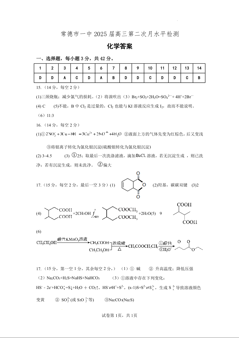 湖南省常德市第一中学2025届高三第二次月水平检测化学答案